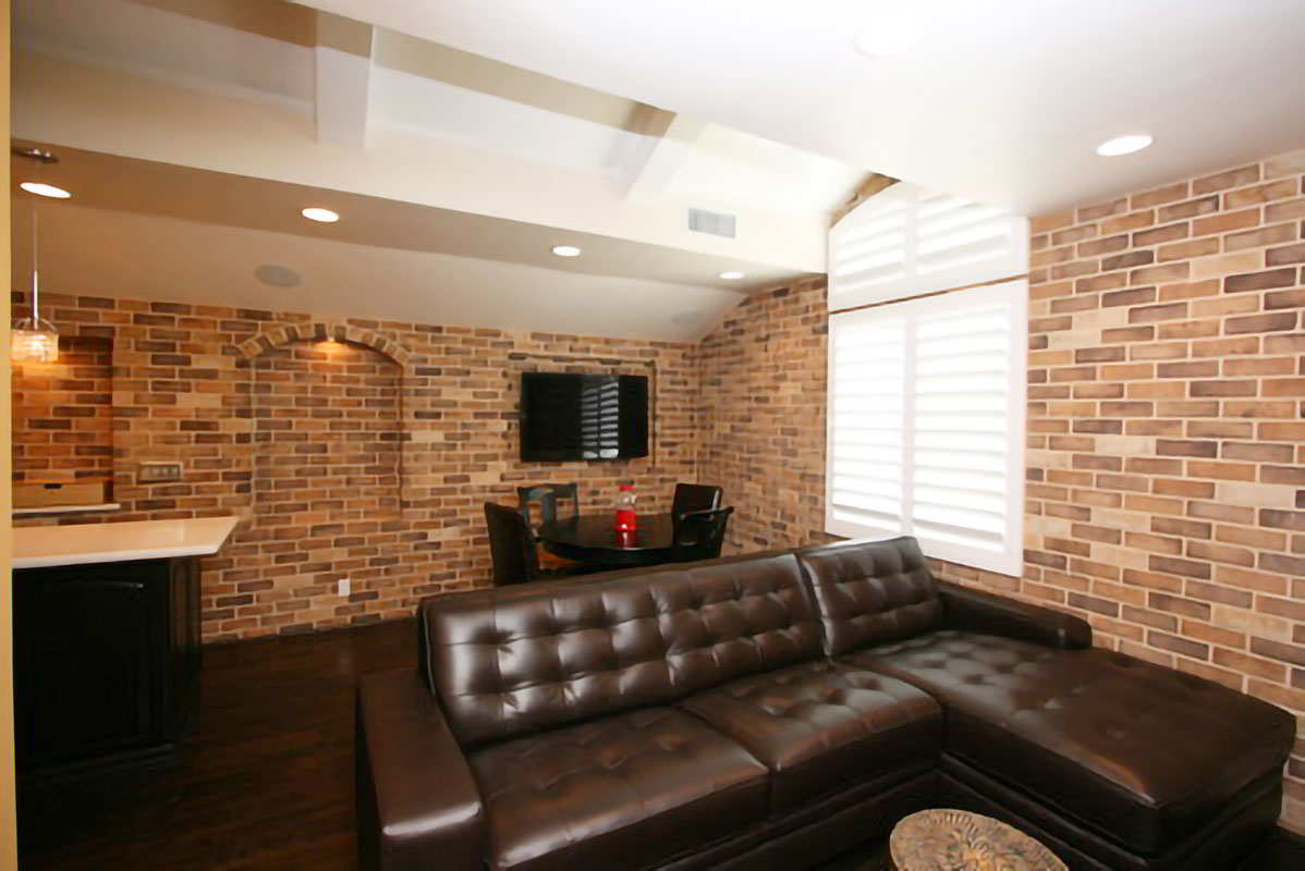 Special features: Bar or mini kitchen with dishwasher, ref, sink, GD, etc. Wire cut brick wall accents using Coronado Stone products, custom wall niches, built in entertainment areas, paneled vault ceiling with arched window and architectural accents, custom ebony cabinetry from DeWils, distressed wood flooring by Elegance and crystal lighting fixtures.